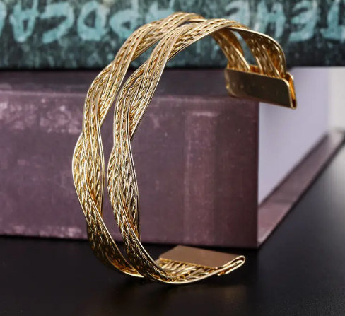 Metal alloy adjustable gold color rattan braided bracelet/bangle.